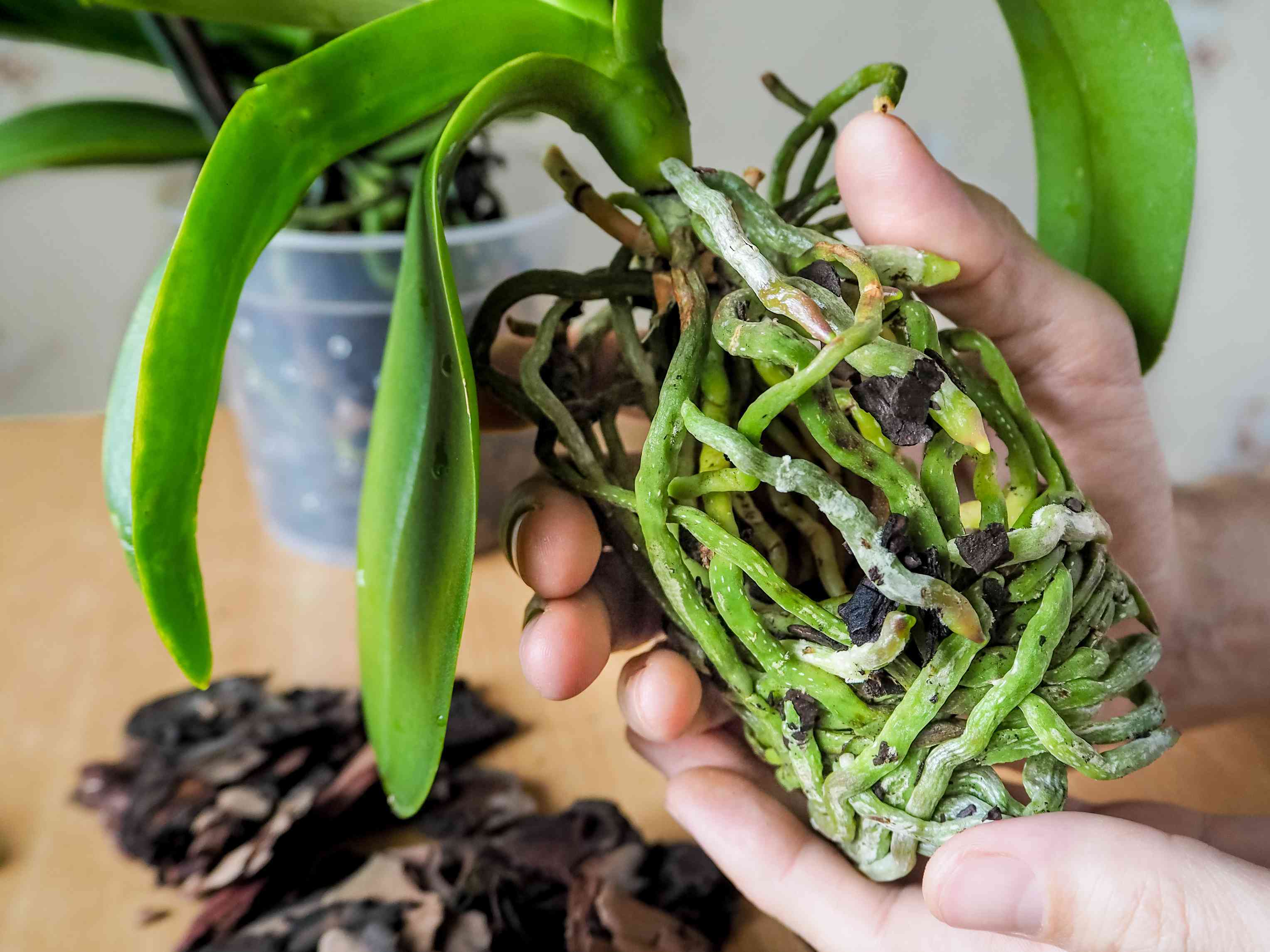 The process itself is quite gentle. Ease the plant out of its pot and take a moment to look at the roots. Healthy roots will feel firm and appear silvery or green, while any that are soft or dark can be removed. Once cleaned up, the plant can be settled back into a pot with fresh orchid bark, allowing the roots to sit naturally without being forced or buried too deeply. Keeping the crown of the plant above the mix is important, as this is where new growth emerges and where moisture should never sit.